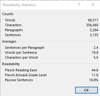 Word tells me I have written 68,517 words, which is about the same as Treasure Island or Brave new World, about two Animal Farms or half a Catch-22. It’s about the length I was going for so I’m happy.