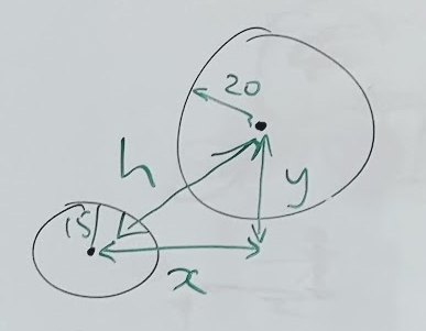 Within a few seconds I got the answer I needed: “Pythagoras”. We can detect whether the two circles have touched, by calculating the diagonal distance between them and comparing with the sum of their radiuses. Hence this code: